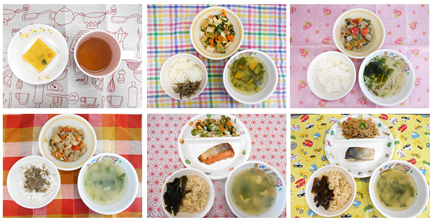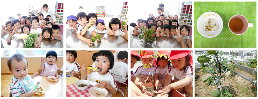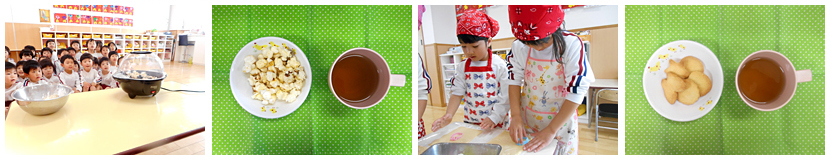 自園献立 ミルク・離乳食 食育のとりくみ 野菜を育てて食べたりクッキーやポップコーンを作ったり、子ども達が楽しみながら食育をしています。 給食・おやつ 和食を中心とした献立です。おやつも手作りが中心です。 ポップコーン作り・クッキー作り 食育研究保育 給食室の職員がお箸の持ち方や食材について楽しく教えています。(毎年変わります)